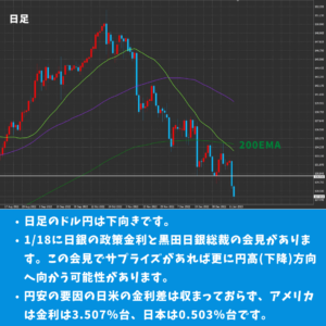 - 1/18に日銀の政策金利と黒田日銀総裁の会見があります。この会見でサプライズがあれば更に円高(下降)方向へ向かう可能性があります。