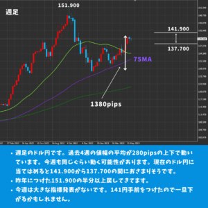 - 週足のドル円です。過去4週の値幅の平均が280pipsの上下で動いています。今週も同じぐらい動く可能性があります。現在のドル円に当てはめると141.900から137.700の間におさまりそうです。